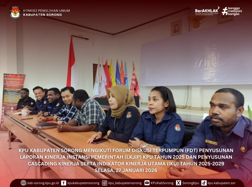 #temanpemilih, Komisi Pemilihan Umum (KPU) Kabupaten Sorong mengikuti Forum Diskusi Terpumpun (FDT) dalam rangka penyusunan Laporan Kinerja Instansi Pemerintah (LKJIP) KPU Tahun 2025, serta penyusunan Cascading Kinerja dan Indikator Kinerja Utama (IKU) KPU Tahun 2025–2029. Selasa, 27 Januari 2026 Kegiatan ini dilaksanakan sebagai bagian dari upaya penguatan tata kelola kinerja yang akuntabel, terukur, dan berkelanjutan di lingkungan KPU. Melalui forum ini, diharapkan seluruh jajaran KPU dapat menyelaraskan perencanaan dan pelaksanaan kinerja guna mewujudkan penyelenggaraan pemilu yang profesional, transparan, dan berintegritas. Turut hadir : 1. Ketua Divisi Teknis Penyelenggaraan, Abdul Salam 2. Ketua Divisi Perencanaan, Data dan Informasi, Marthen Luther Kambuaya 3. Ketua Divisi Hukum dan Pengawasan, Frans Leonard Kalaibin 4. Ketua Divisi Sosialisasi Pendidikan Pemilih, Partisipasi Masyarakat dan Sumber Daya Manusia, Yanthi Kambuaya 5. Sekretaris KPU Kabupaten Sorong, Marthen Kambuaya 6. Para Kasubag dan Operator ....