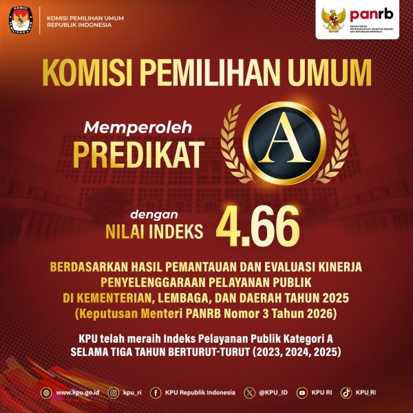 #temanpemilih Komisi Pemilihan Umum (KPU) berhasil meraih Indeks Pelayanan Publik (IPP) Predikat A dengan nilai indeks 4,66 berdasarkan Hasil Pemantauan dan Evaluasi Kinerja Penyelenggaraan Pelayanan Publik di Kementerian, Lembaga, dan Pemerintah Daerah Tahun 2025. Capaian tersebut tertuang dalam Keputusan Menteri Pendayagunaan Aparatur Negara dan Reformasi Birokrasi (PANRB) Nomor 3 Tahun 2026 tentang Hasil Pemantauan dan Evaluasi Kinerja Penyelenggaraan Pelayanan Publik Tahun 2025. Predikat A yang diraih KPU menunjukkan kinerja pelayanan publik yang sangat baik, mencerminkan komitmen kuat KPU dalam menghadirkan layanan kepemiluan yang profesional, transparan, dan berorientasi pada kepuasan masyarakat. Penilaian ini mencakup berbagai aspek, antara lain kebijakan pelayanan, profesionalisme sumber daya manusia, sarana dan prasarana, pemanfaatan teknologi informasi, serta pengelolaan pengaduan masyarakat. Keberhasilan ini menjadi bukti nyata upaya berkelanjutan KPU dalam melakukan reformasi birokrasi dan peningkatan kualitas layanan publik, sejalan dengan prinsip tata kelola pemerintahan yang baik (good governance). #kpumelayani #reformasibirokrasi #layananmaksimal #goodgoverment ....