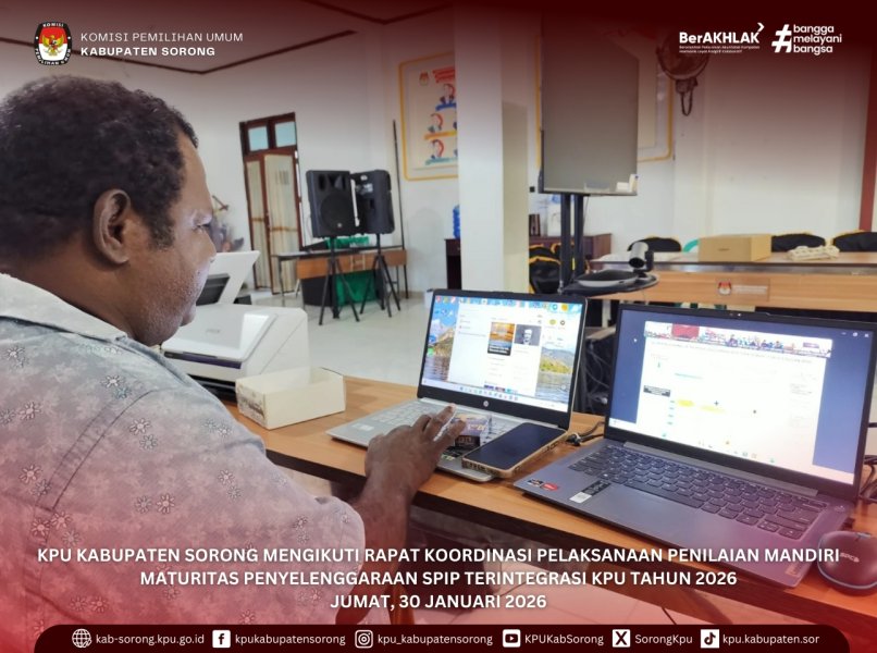 #temanpemilih, Komisi Pemilihan Umum (KPU) Kabupaten Sorong mengikuti Rapat Koordinasi Pelaksanaan Penilaian Mandiri Maturitas Penyelenggaraan Sistem Pengendalian Intern Pemerintah (SPIP) Terintegrasi KPU Tahun 2026. Jumat, 30 Januari 2026. Kegiatan ini diikuti oleh Kepala Sub Bagian Teknis dan Hukum KPU Kabupaten Sorong, Yan Minggus Kambu, sebagai bentuk komitmen dalam memperkuat tata kelola organisasi yang akuntabel, transparan, dan berintegritas. Melalui rakor ini, KPU Kabupaten Sorong berupaya meningkatkan pemahaman serta kesiapan satuan kerja dalam melaksanakan penilaian mandiri SPIP secara terintegrasi, guna mendukung terwujudnya penyelenggaraan pemilu yang profesional dan berkeadilan. ....