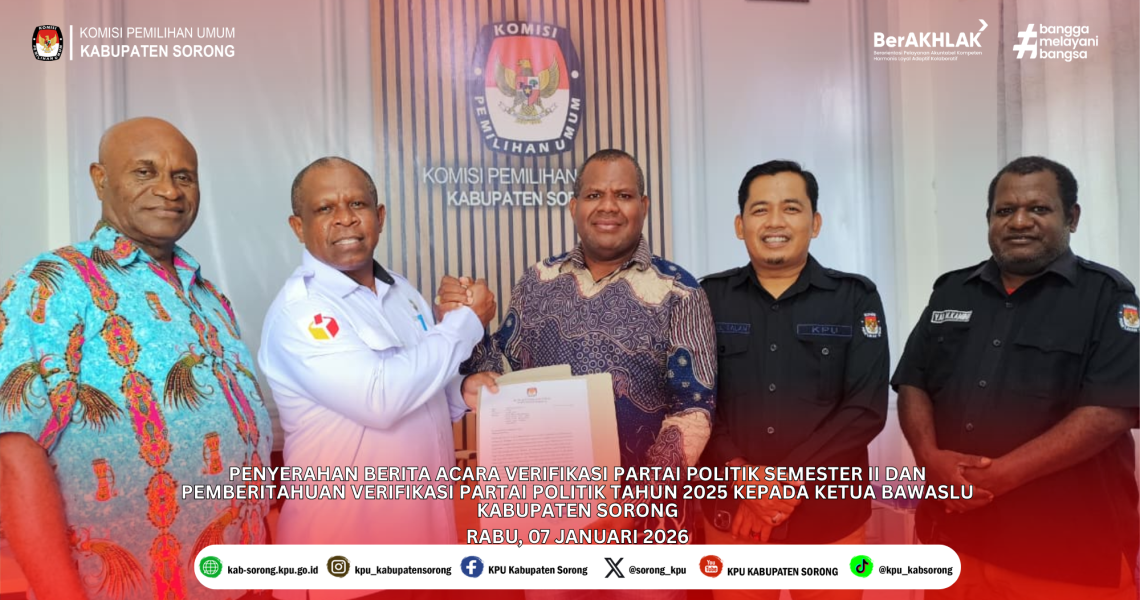 Komisi Pemilihan Umum (KPU) Kabupaten Sorong melaksanakan kegiatan penyerahan Berita Acara Hasil Pemutakhiran Data Partai Politik Berkelanjutan Semester II sekaligus Pengumuman Hasil Pemutakhiran Data Partai Politik Berkelanjutan Semester II Tahun 2025 kepada Badan Pengawas Pemilihan Umum (Bawaslu) Kabupaten Sorong.