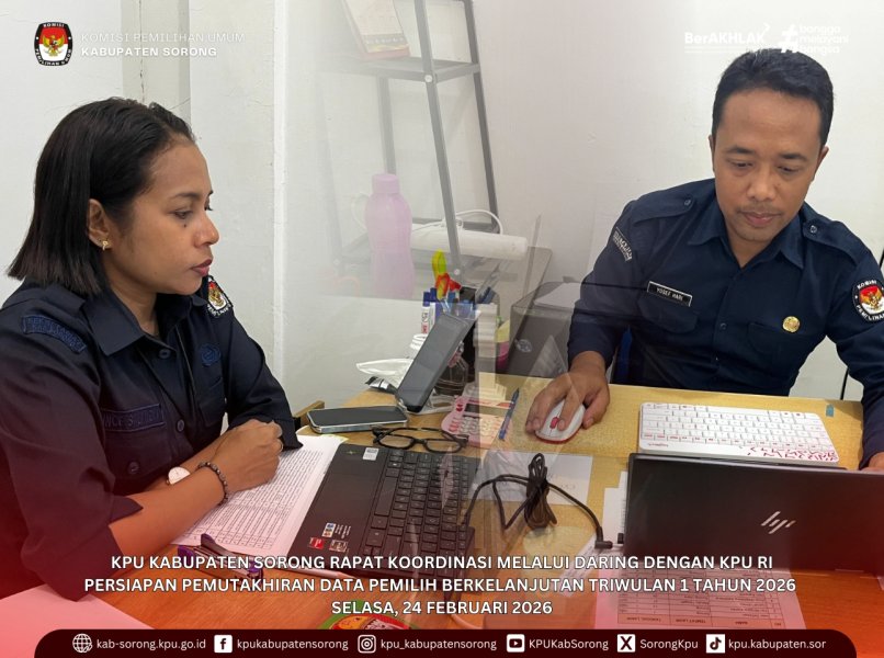 KPU Kabupaten Sorong mengikuti Rapat Koordinasi secara daring bersama KPU RI terkait Persiapan Pemutakhiran Data Pemilih Berkelanjutan (PDPB) Triwulan I Tahun 2026 pada Selasa, 24 Februari 2026.