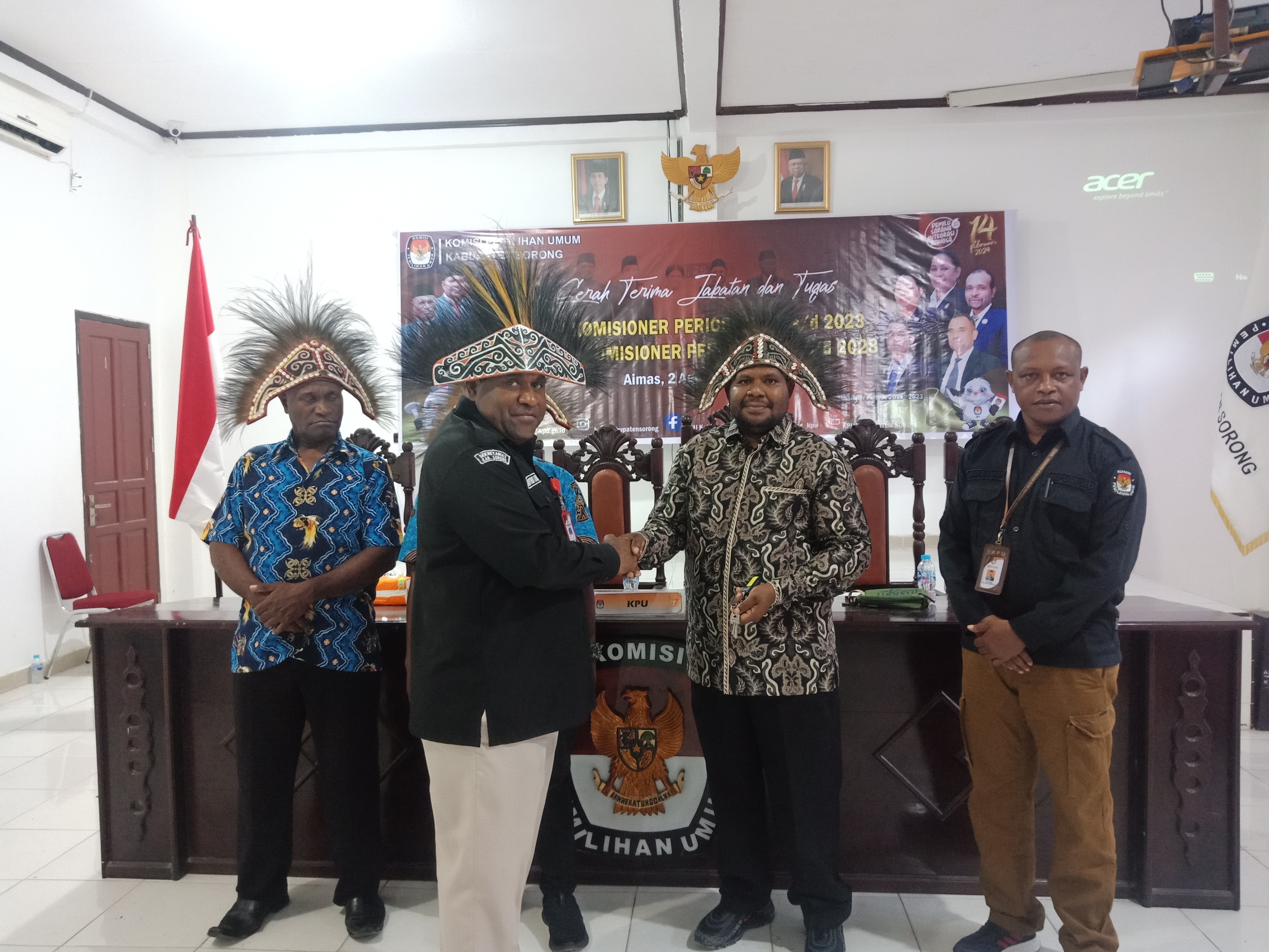 Serah Terima Jabatan dan Tugas dari Komisioner Periode 2018-2023 kepada Komisioner Baru 2023-2028 Usai dilantik, Sekreariat KPU Kabupaten Sorong gelar acara penyambutan sekaligus Serah Terima Jabatan dan Tugas dari Komisioner Periode 2018-2023 kepada Komisioner Baru periode 2023-2028. Rabu, (2/8/23). Dipimpin langsung oleh Sekretaris KPU Kabupaten Sorong, Marthen Kambuaya mendampingi Ketua KPU Kabupaten Sorong, Frangky Duwith, Kepala Divisi Data dan Informasi, bapak Marthen L. Kambuaya, dan Kepala Divisi Hukum dan Pengawasan, bapak Frans Leonard Kalaibin. Diawali dengan prosesi pemakaian mahkota kepada Komisioner baru oleh Sekretaris KPU Kabupaten Sorong, Marthen Kambuaya, acara tersebut dilanjutkan dengan sambutan sambutan hangat Komisioner terpilih kepada seluruh peawai Sekretariat. Dalam sambutannya Ketua KPU Terpilih, Frangky Duwith menuturkan ucapan terimakasih kepada seluruh pegawai Sekretariat atas sambutan hangatnya, beliau juga memohon maaf mewakili dua rekan komisioner lainya yakni Kepala Divisi Parmas dan SDM, Yanthi Kambuaya dan Kepala Divisi Hukum dan Pengawasan, Abdul Salam yang belum bisa hadir karena masih ada jadwal giat Divisi di pusat. Dalam kesempatan tersebut turut dihadiri oleh Ketua KPU Provinsi Papua Barat Daya yang diwakili oleh Kepala Divisi Perencanaan Data dan Informasi, Jefri Obeth Kambu, komisioner KPU periode 2018-2023, ketua KPU kabupaten Sorong, Adomincce Y. Pandori, Kepala Divisi Teknis Penyelenggaraan, Petrus M. Aitrem, Kepala Divisi Parmas dan SDM, Selfianus Kalaibin, Kepala Divisi Hukum dan Pengawasan, Mulyanto D. Ruslan. Di lanjutkan Penyerahan Pelakat atas dedikasi dan penghargaan purna tugas kepada Komisioner KPU Kabupaten Sorong periode 2018-2023, diserahkan oleh Sekretaris dan Komisioner KPU Kabupaten Sorong periode 2023-2028. Acara tersebut ditutup dengan penyerahan aset berupa fasilitas kendaraan dan kunci ruangan oleh Sekretaris KPU Kabupaten Sorong kepada komisioner terpilih periode 2023-2028.