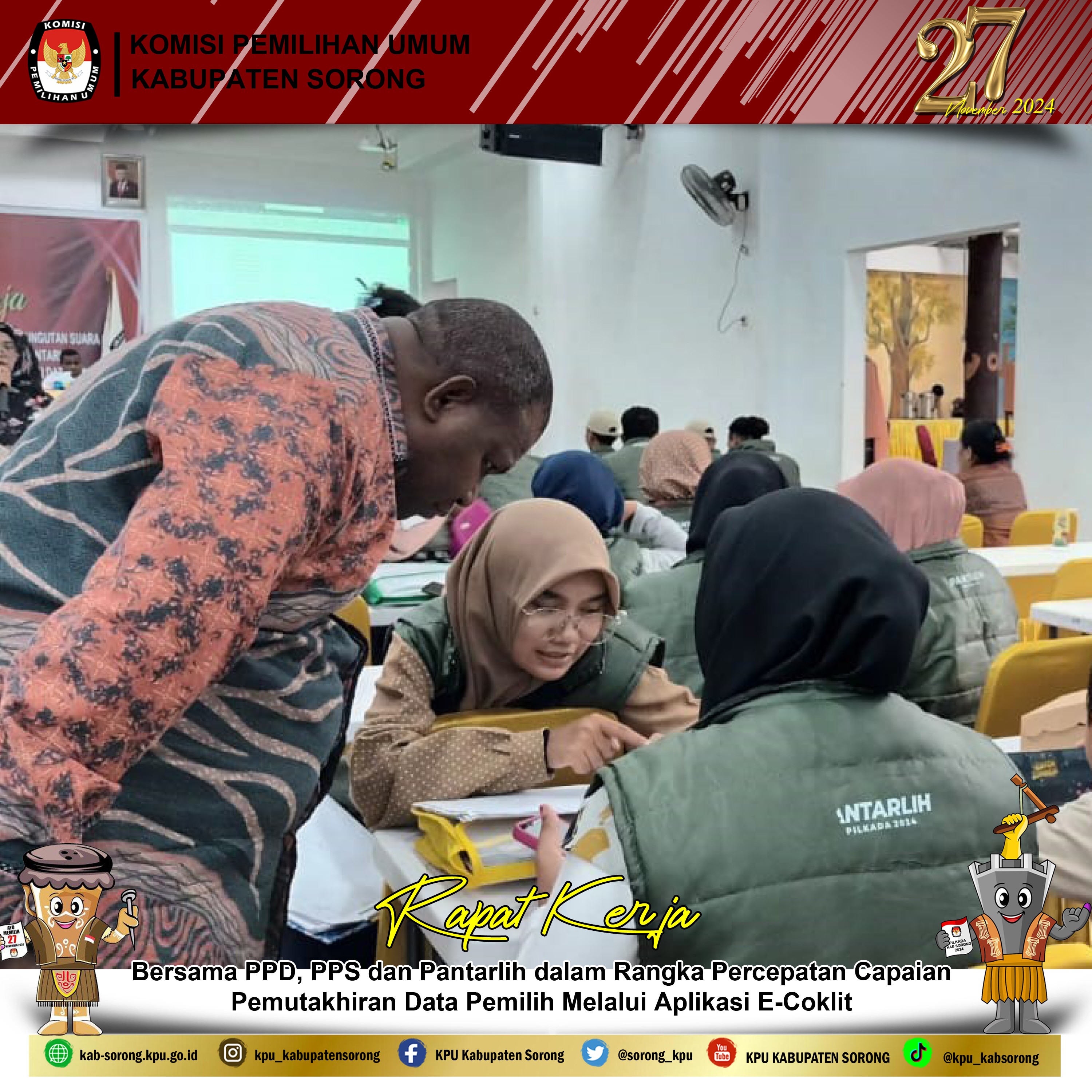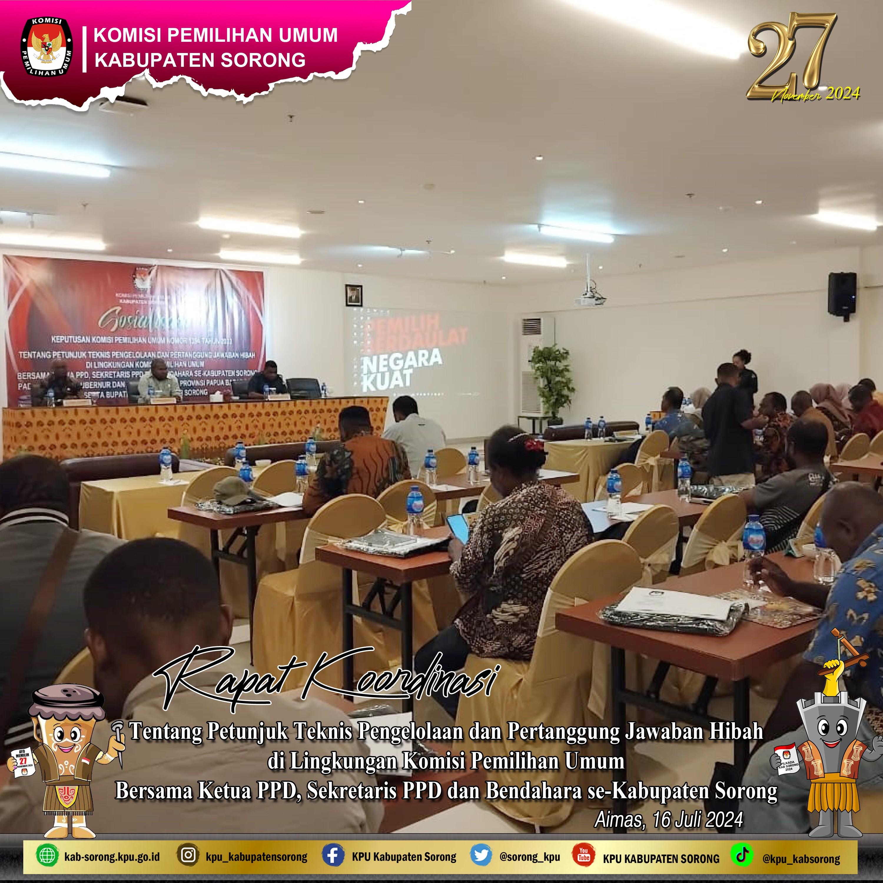 #TemanPemilih. KPU Kabupaten Sorong pada Selasa, 16 Juli 2024 melakukan Giat terkait Rapat Koordinasi Keputusan Komisi Pemilihan Umum Nomor 1394 Tahun 2023 tentang Petunjuk Pengelolaan dan Pertanggung Jawaban Hibah di Lingkungan KPU Kabupaten Sorong bersama Ketua PPD, Sekretaris PPD dan Bendahara PPD se-Kabupaten Sorong pada Pemilihan Gubernur dan Wakil Gubernur Provinsi Papua Barat Daya serta Bupati dan Wakil Bupati Sorong Tahun 2024.