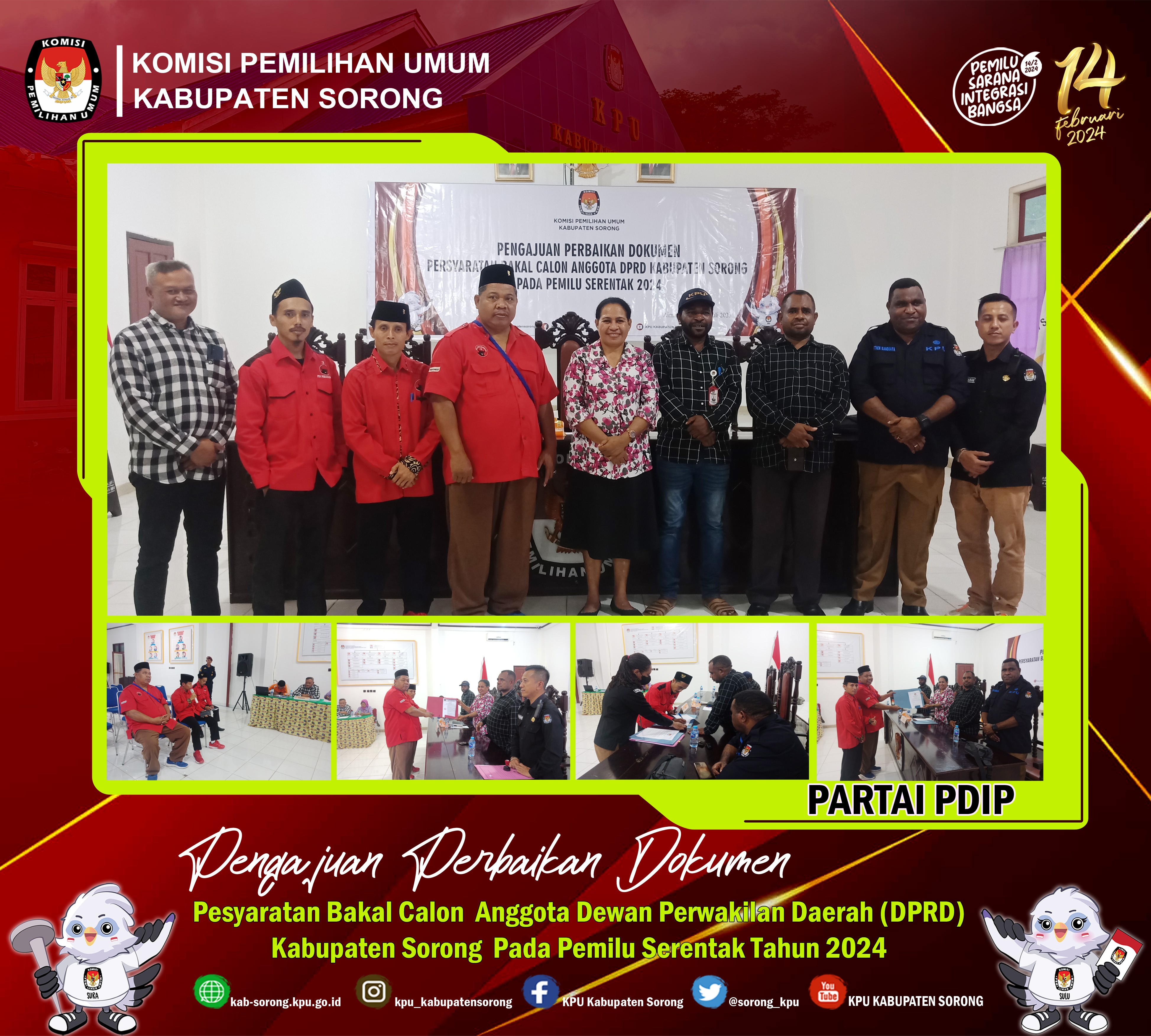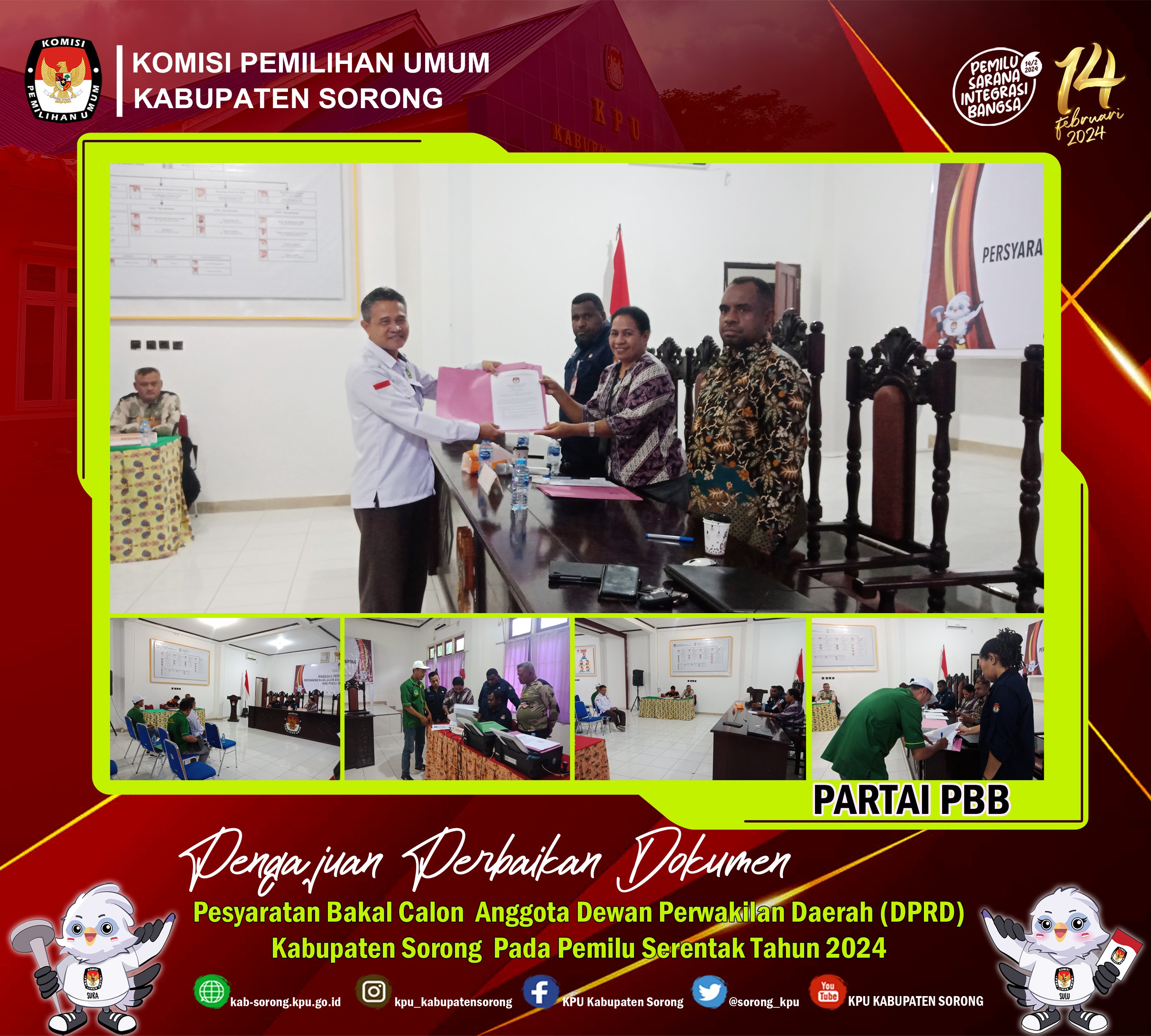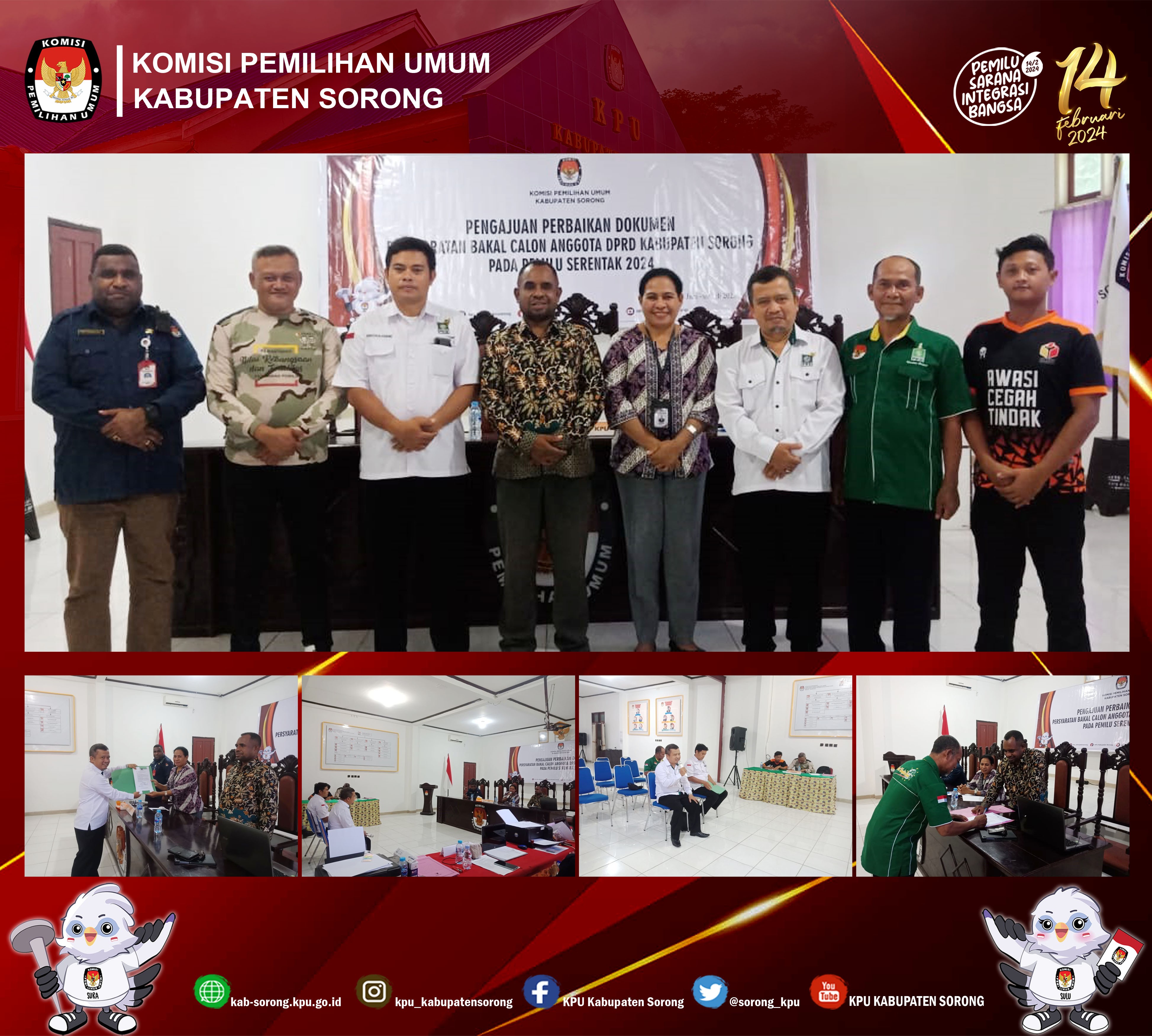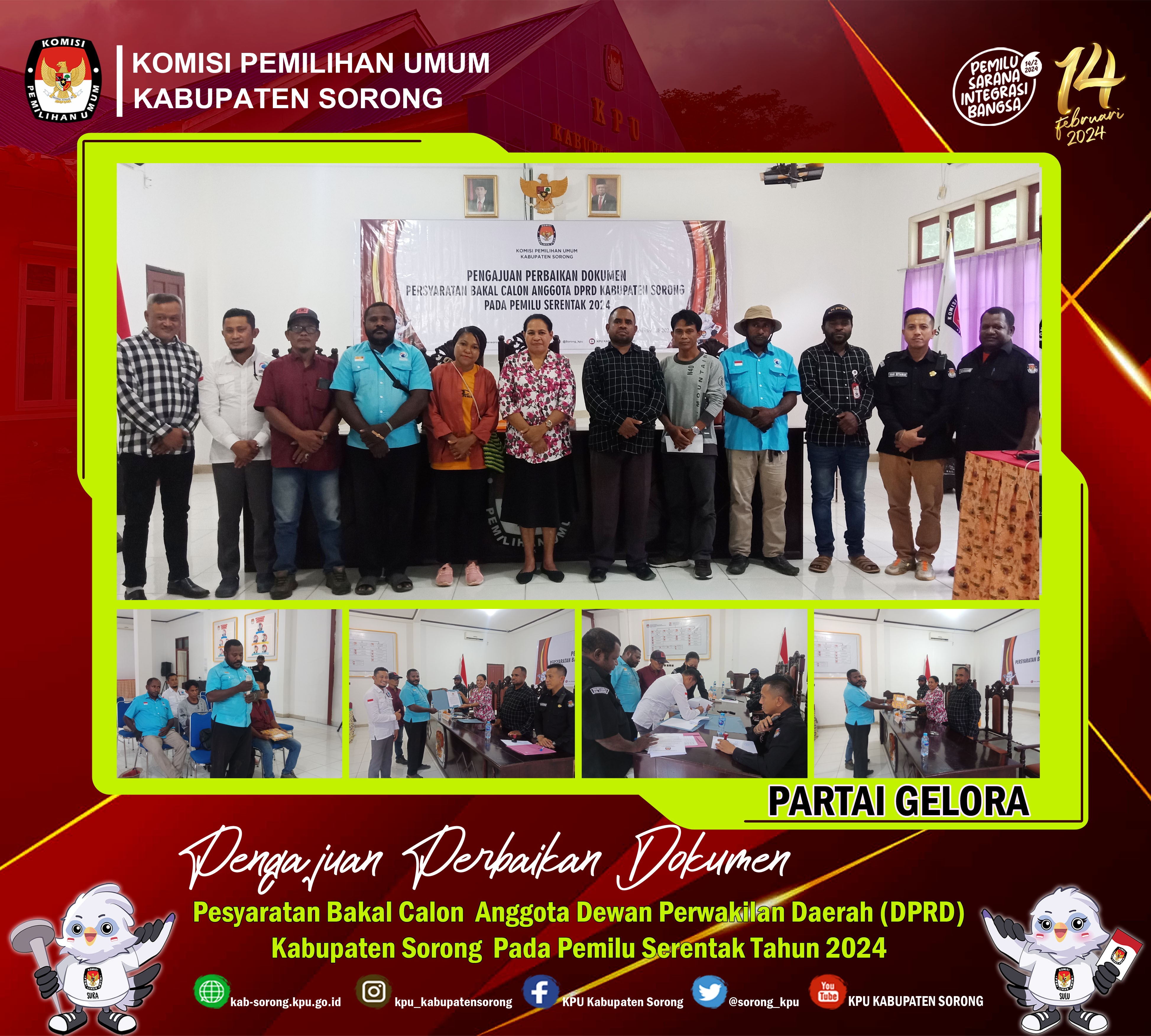 Pada pukul 10.30 WIT (waktu register) tanggal 09 Juli 2023 KPU Kabupaten Sorong menerima kedatangan Partai GELORA dalam hal ini ketua, Sekertaris bersama dengan LO sebanyak 3 orang yang berada di dalam ruangan penyerahan Aula KPU Kabupaten Sorong. (07/13) Kedatangan ketua, Sekertaris dan LO/Admin partai GELORA Kabupaten Sorong sebagaimana dimaksud dalam rangka pengajuan perbaikan dokumen persyaratan administrasi bakal calon anggota DPRD tingkat Kabupaten Sorong Provinsi Papua Barat Daya dalam Pemilu Tahun 2024. Pengajuan perbaikan dokumen dimaksud di terima langsung oleh Ketua KPU Kabupaten Sorong dalam hal ini Ibu Adomince Y. Pandori, Bapak Petrus M. Aitrem Selaku Kepala Divisi Teknis Penyelenggara, Bapak Selfianus Kalaibin Selaku Kepala Divisi SDM dan PARMAS bersama Bapak Marthen Kambuaya Selaku Sekretaris KPU Kabupaten Sorong yang selanjutnya dilakukan pemeriksaan oleh tim Admin SILON KPU Kabupaten Sorong (Bapak Yan Minggus Kambu) bersama admin/LO parpol serta Bawaslu Kabupaten Sorong turut dalam melakukan pengecekan dokumen terhadap kesesuaian dan kelengkapan dokumen fisik dan dokumen digital dri Unsur Partai GELORA dengan hasil pemeriksaan di terima dan lengkap (diberikan tanda terima penerimaan dan BA). Berikut Proses pengajuan berakhir hingga pukul 12.22 WIT berjalan lancar, aman dan tertib tanpa adanya kejadian khusus Dan di nyatakan SESUAI PERSYATAN yang di minta dan DITERIMA.