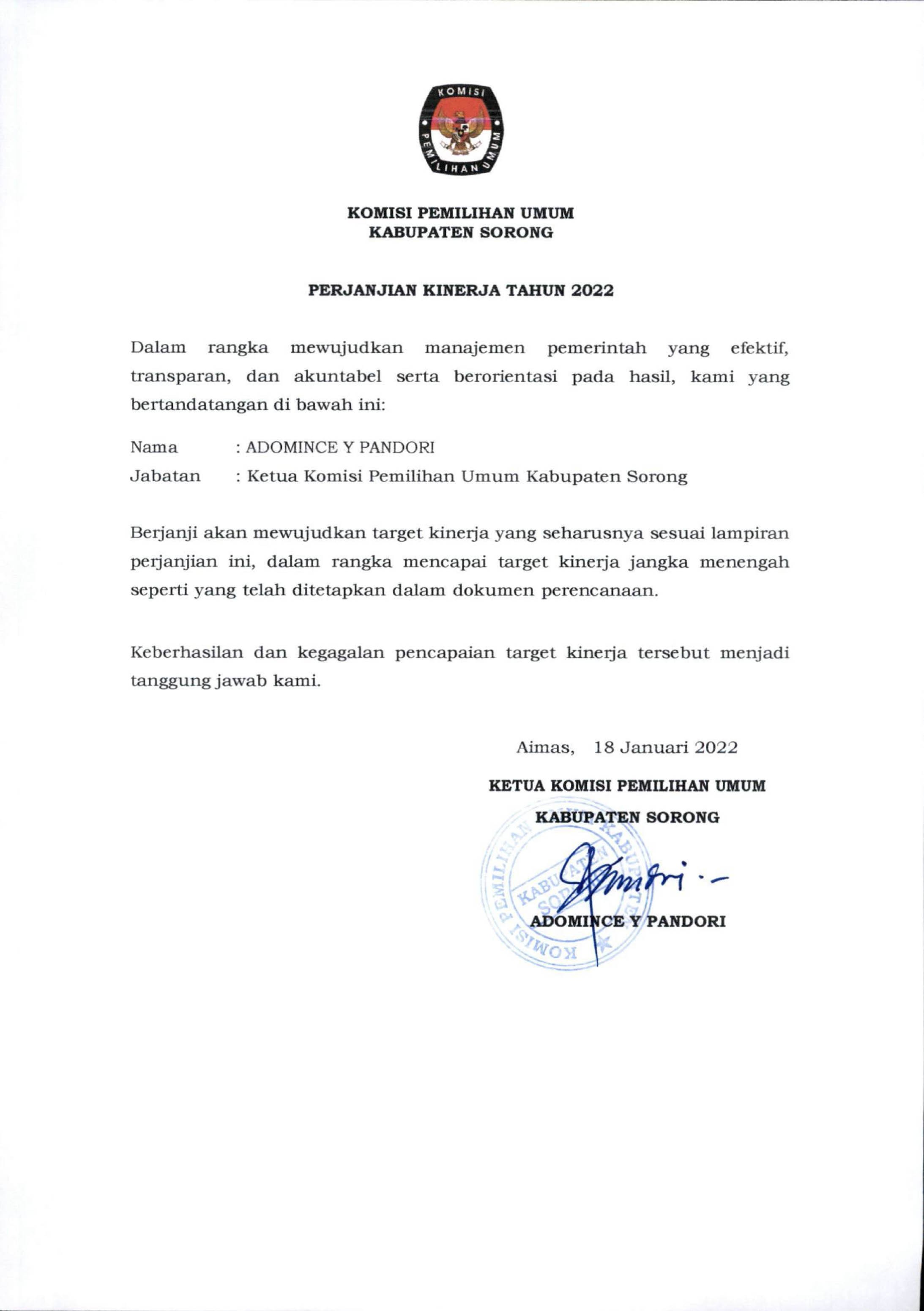 Penandatanganan Perjanjian Kinerja Tahun 2022 merupakan wujud komitmen KPU Kabupaten Sorong dalam upaya penguatan akuntabilitas kinerja dalam mewujudkan manajemen pemerintahan yang efektif, transparan, dan akuntabel serta berorientasi pada hasil.