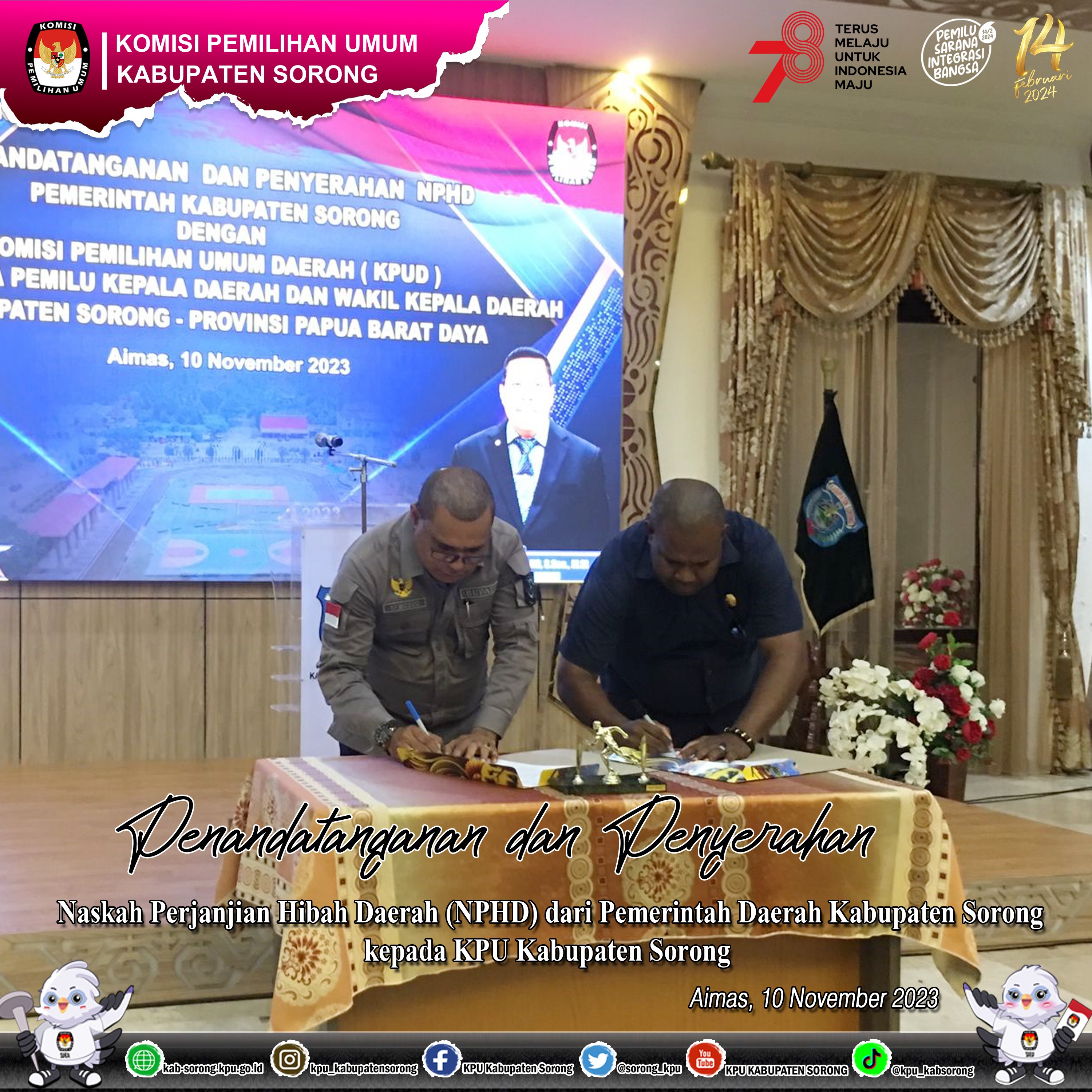 TemanPemilih, Menuju 92 Hari Menjelang Hari Pemungutan Suara, Berdasarkan Surat Edaran dari Kemendagri Nomor 900.1.9.1/5252/SJ tertanggal 29 September 2023 tentang Pendanaan Kegiatan Pemilihan Gubernur dan Wakil Gubernur, Bupati dan Wakil Bupati, serta Walikota dan Wakil Walikota Tahun 2023. Dan Surat Kemendagri Nomor 900.1.9.1/16888/Keuda tertanggal 02 November tentang Percepatan Penandatangan Naskah Perjanjian Hibah Daerah (NPHD) Pendanaan Kegiatan Pemilukada Tahun 2024, Pada hari Jumat tanggal 10 November 2023 bertempat di Pendopo Kediaman Bupati Sorong Pemerintah Kabupaten Sorong menghibahkan dana Pemilihan Umum Kepala Daerah Tahun 2024 Kepada KPU Kabupaten Sorong. Penyerahan dana ini ditandai dengan penandatangan Naskah Perjanjian Hibah Daerah (NPHD) oleh Pejabat Bupati Sorong Yan Piet Mosso dan Ketua KPU Kabupaten Sorong Frengki Duwith. Pada Kesempatan ini Penjabat Bupati Sorong Yan Piet Mosso menyampaikan bahwa Pemilu dan Pemilukada 2024 mencapai predikat sukses, aman dan berkualitas karena seluruh pihak ikut serta bertanggungjawab untuk memastikan penyelenggaraan kedua momentum itu.Dan Pejabat Bupati Sorong percaya bahwa KPU Kabupaten Sorong akan melaksanakan tanggung jawab untuk menentukan arah pesta Demokrasi 2024 yang aman, lancar. Sementara itu Ketua KPU Kabupaten Sorong Frengki Duwith, S.Hut menyampaikan terimakasih dan apresiasi sebesar-besarnya kepada Pemerintah Daerah Kabupaten Sorong atas dukungan kepada KPU Kabupaten Sorong dalam menjalankan proses Pemilukada Tahun 2024 di lingkungan Kabupaten Sorong