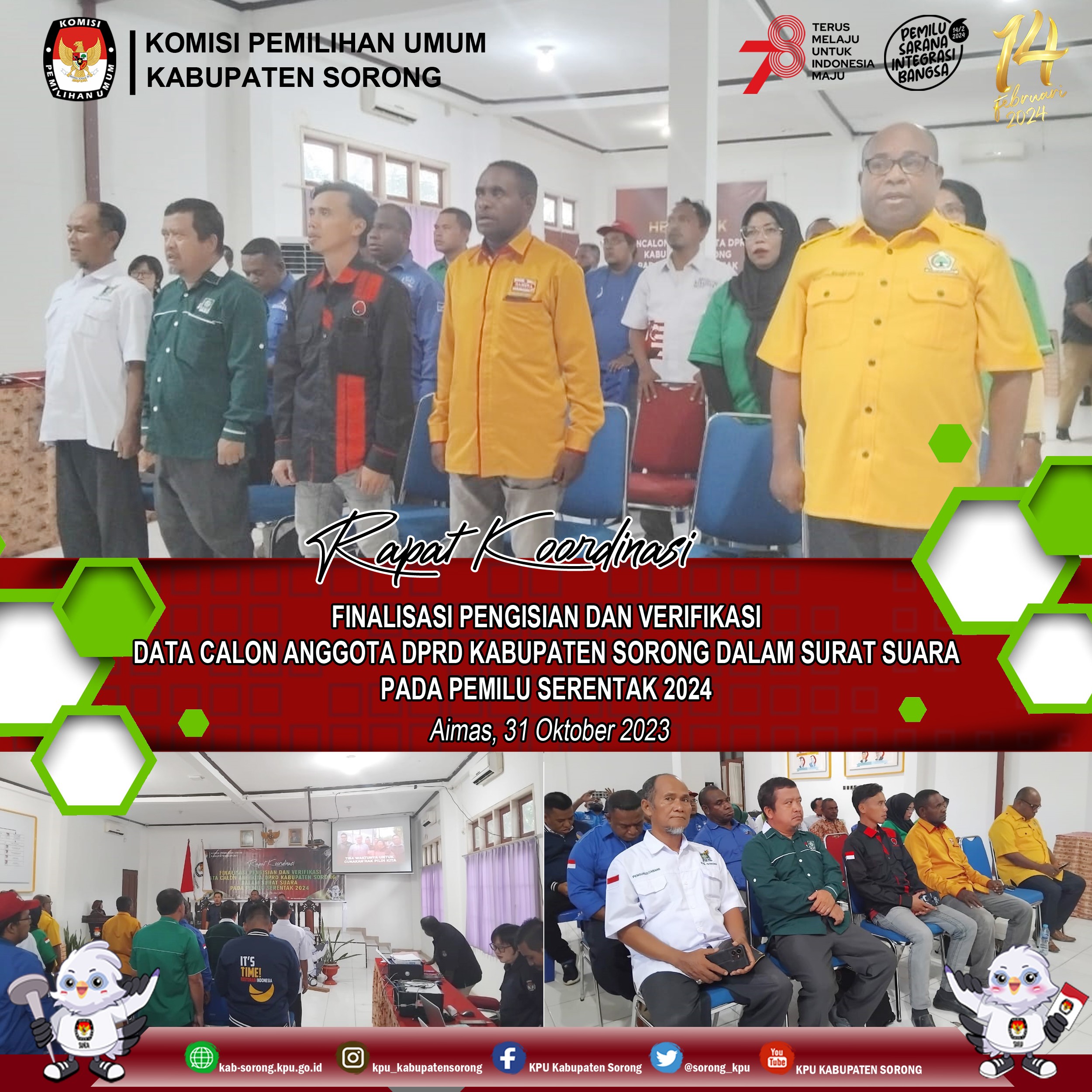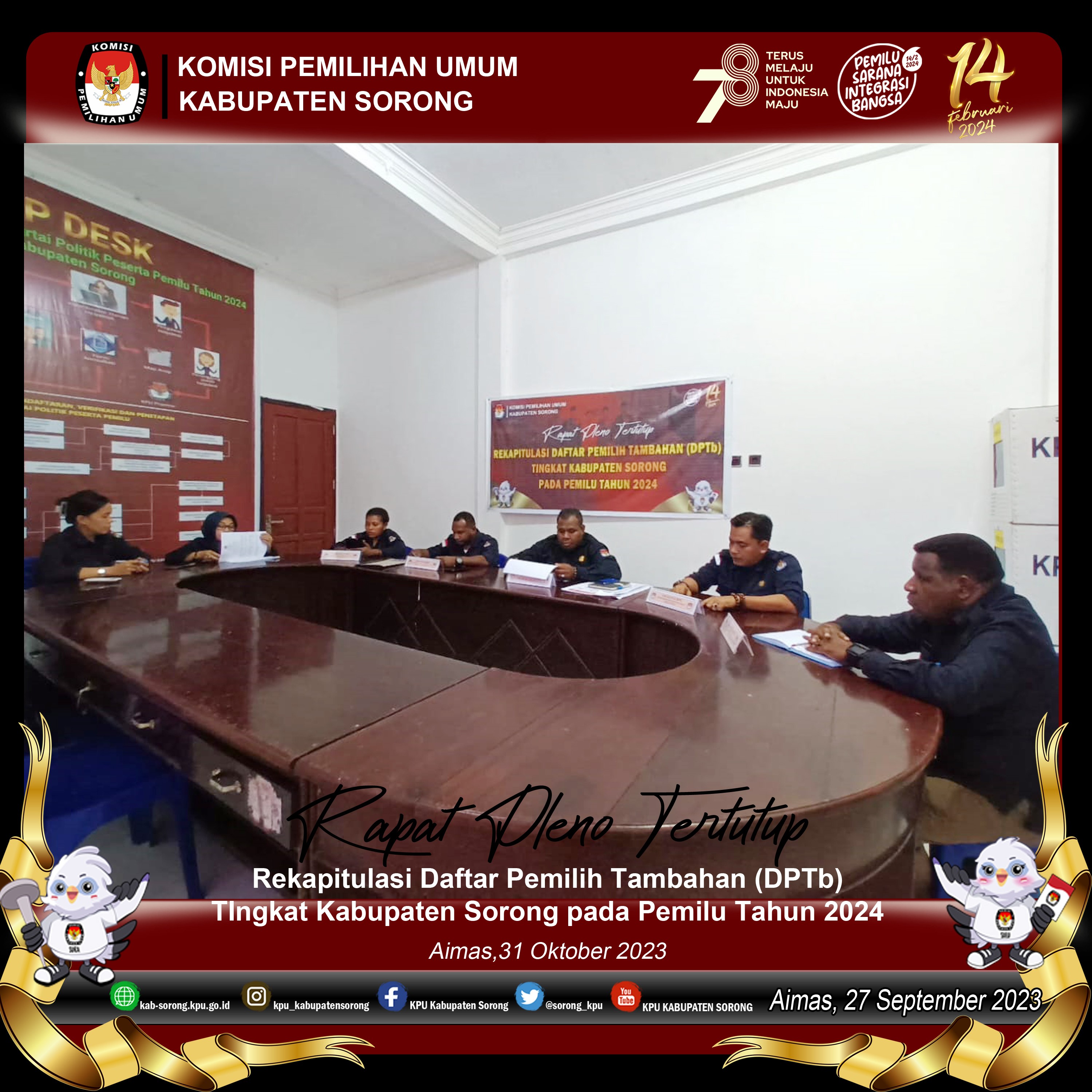 #TemanPemilih, menuju 105 hari menjelang pemilu, KPU Kabupaten Sorong melakukan Rapat Pleno Tertutup Rekapitulasi DPTb tingkat Kabupaten Sorong per bulan Oktober. Selasa, 31/10/23. Rapat dipimpin oleh ketua KPU Kabupaten Sorong, dan dihadiri oleh Kadiv Perencanaan, Data dan Informasi bapak Marthen Luther Kambuaya, Kadiv Teknis Penyelenggaraan bapak Abdul salam, kadiv Sosdikli, Parmas dan SDM ibu Yanthi Kambuaya, Sekretaris KPU Kabupaten Sorong bapak Marthen Kambuaya, Kasubag Program dan Data ibu Kris Roso P. beserta staff. Pleno DPTb tersebut tertuang dalam Berita Acara Nomor: 268/PL.02.1-BA/9601/2023. yang berisi sebagai berikut: Jumlah Kecamatan : 11 Pemilih Pindah Masuk Jumlah Desa/Kelurahan : 19 Jumlah TPS : 25 Jumlah Pemilih Tambahan : 51 Pemilih Pindah Keluar Jumlah Desa/Kelurahan : 21 Jumlah TPS : 31 Jumlah Pemilih Tambahan : 49 Rapat ditutup dengan penandatanganan Berita Acara Pleno Rekapitulasi DPTb tingkat Kabupaten Sorong oleh pimpinan komisioner KPU Kabupaten Sorong.