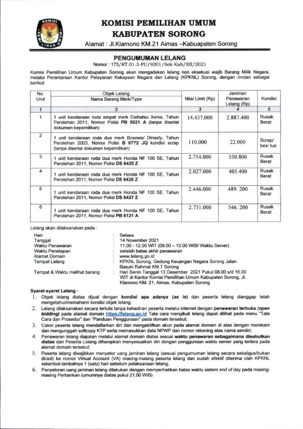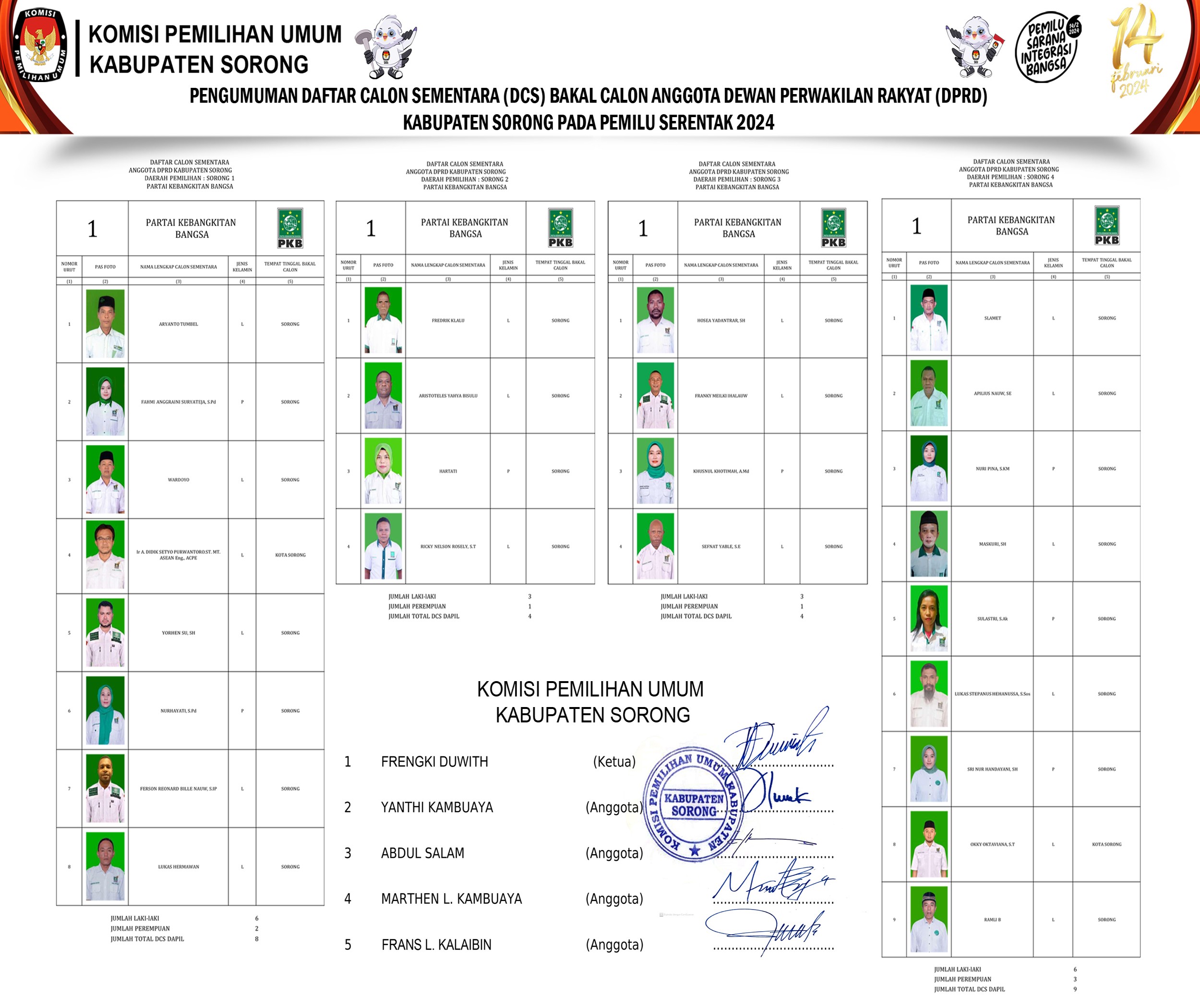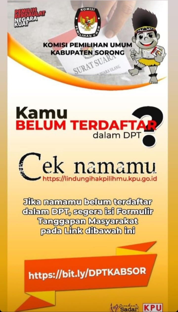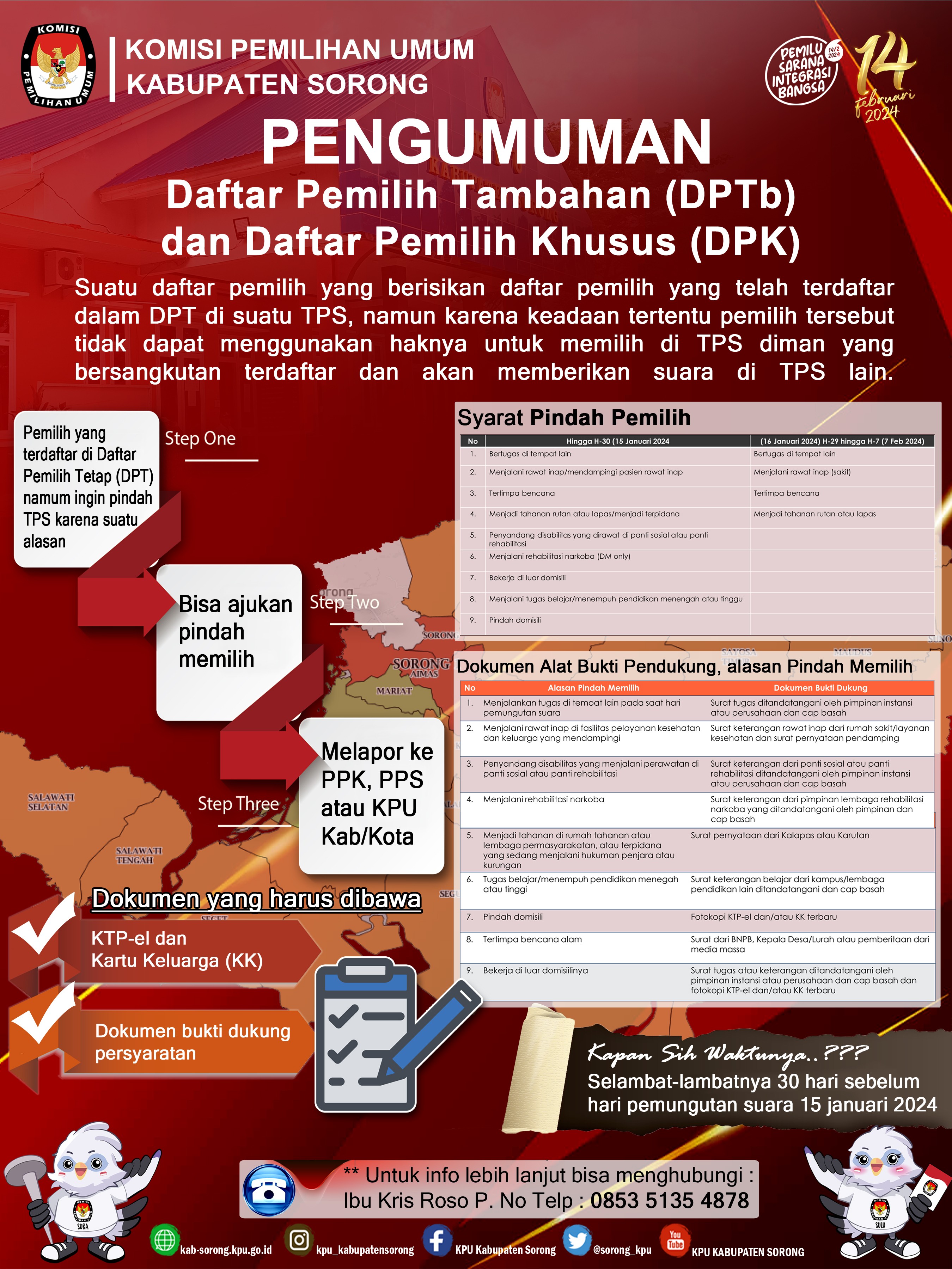 Berdasarkan Peraturan Komisi Pemilihan Umum Nomor 7 Tahun 2022 tentang Penyusunan Daftar Pemilih dalam Penyelenggaraan Pemilihan Umum dan Sistem Informasi Data Pemilih sebagaimana telah diubah pada Peraturan Nomor 7 Tahun 2023 tentang Perubahan atas Peraturan Komisi Pemilihan Umum Nomor 7 Tahun 2022 tentang Penyusunan Daftar Pemilih dalam Penyelanggaan Pemilihan Umum dan Sistem Informasi Datar Pemilih serta berdasarkan Keputususan Komisi Pemilihan Umum Nomor 27 Tahun 2023 tentang Pedoman Teknis Penyusunan Daftar Pemilih Dalam Negeri pada Penyelenggaraan Pemilihan Umum dan Keputusan Komisi Pemilihan Umum Nomor 55 Tahun 2023 tentang Pedoman Teknis Penyusunan Daftar Pemilih Luar Negeri pada Penyelenggaraan Pemilihan Umum maka PPS, PPK, KPU/KIP Kabupaten/Kota dan PPLN akan melaksanakan tahapan Penyusunan Daftar Pemilih Tambahan (DPTB) dan memperhatikan Putusan MK Nomor 20/PUU-XVII/2019. Berkaitan dengan hal tersebut , maka KPU Kabupaten Sorongh sebagai Penyelenggara Pemilu di tingkat Kabupaten Sorong memberikan pengumuman sebagai berikut :